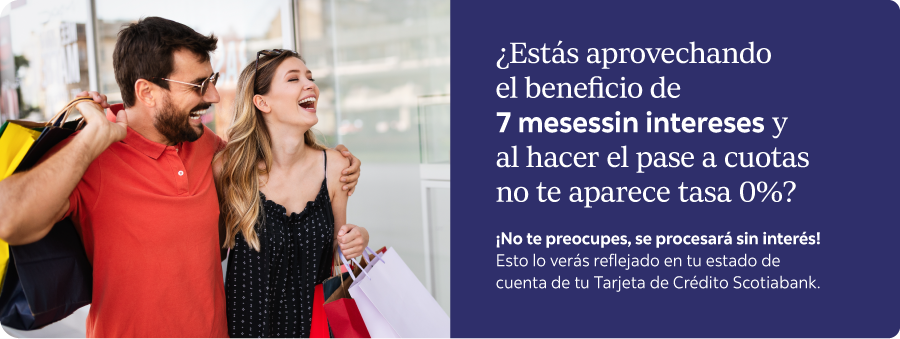 Scotiabank no es responsable por los productos adquiridos en marco del beneficio, en el comercio respectivo. Los productos sujetos al beneficio serán determinados por cada comercio respectivo, no siendo responsabilidad de Scotiabank en caso no hubiese existencias de los productos ofrecidos a través de las plataformas publicitarias y/o informativas de cada uno de los comercios. Scotiabank no garantiza la idoneidad, seguridad, calidad entre otros aspectos de los productos que ofrezcan cada uno de los comercios. Scotiabank no es responsable por la disponibilidad del beneficio de las compras en 7 cuotas sin intereses, debido a que el comercio puede bloquear las transacciones en cuotas sin intereses o con intereses según sus políticas.